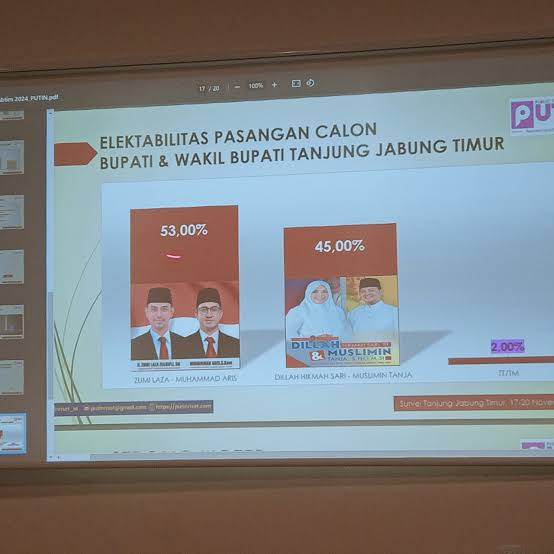 Dari hasil survei yang dilakukan PUTIN di 56 kelurahan dan desa yang berada di 11 kecamatan di wilayah Kabupaten Tanjabtim, pasangan calon bupati dan wakil bupati Tanjabtim nomor urut 1, Zumi Laza-Muhammad Aris unggul 53 persen dari pasangan calon nomor urut 2 Dillah-Muslim yang 45 persen.