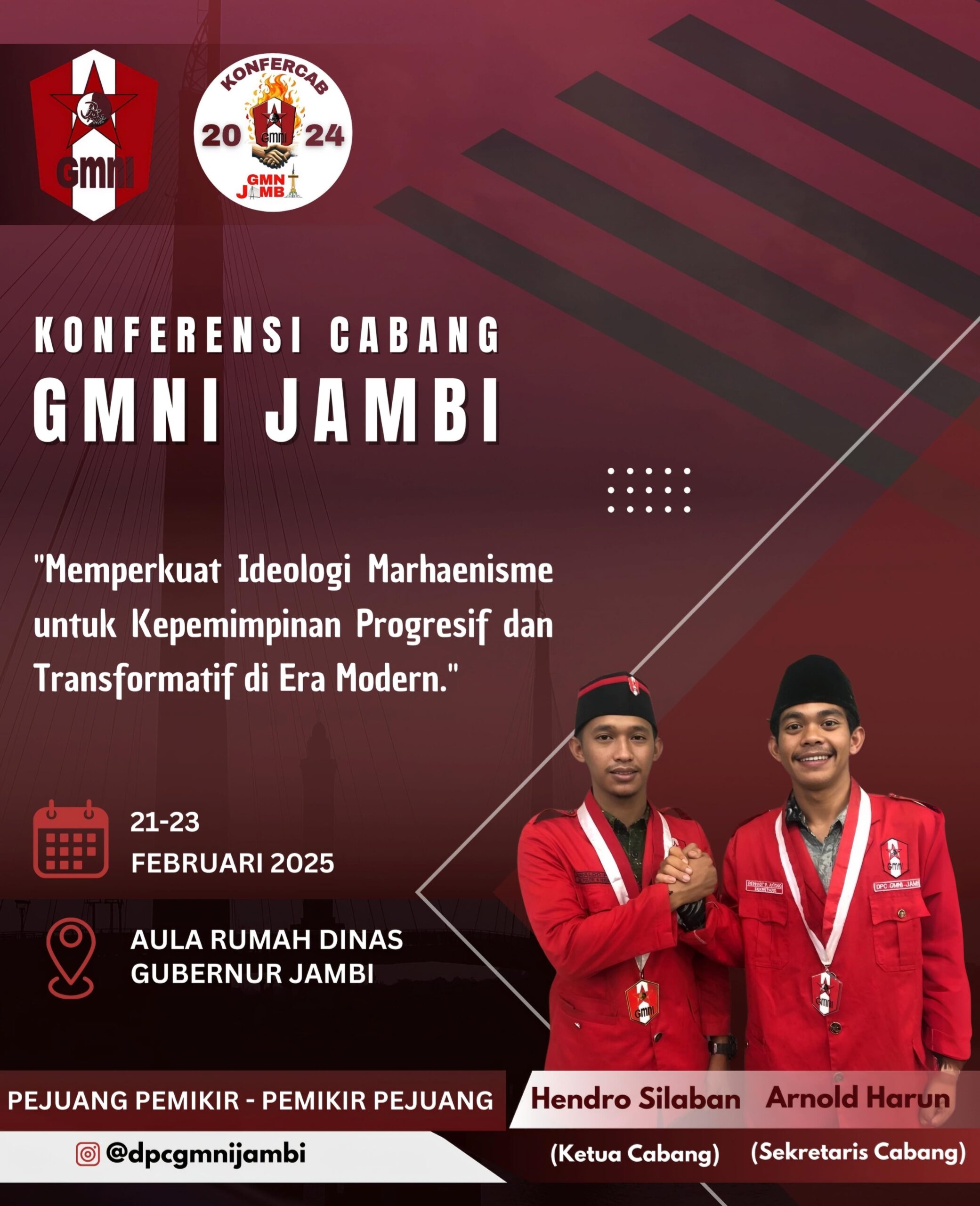 Konfercab DPC GMNI Jambi akan berlangsung pada tanggal 21-23 Februari 2025. Agenda ini akan dihadiri oleh seluruh anggota dan kader GMNI Jambi.