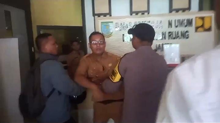 Namun, setelah aksi berakhir, kericuhan tiba-tiba pecah di halaman Kantor PUPR Kota Jambi. Ketegangan muncul saat seorang pegawai PUPR yang tidak disebutkan namanya bertindak arogan terhadap massa aksi yang sedang duduk.