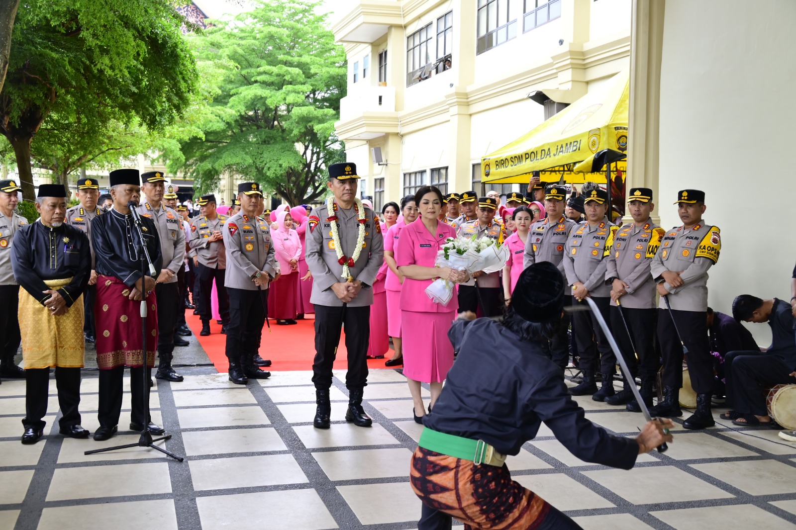 Kapolda Jambi yang baru disambut dengan tradisi adat Melayu Jambi, yang meliputi silat Melayu, Kato Bejawab, dan penaburan beras kunyit sebagai simbol penghormatan.