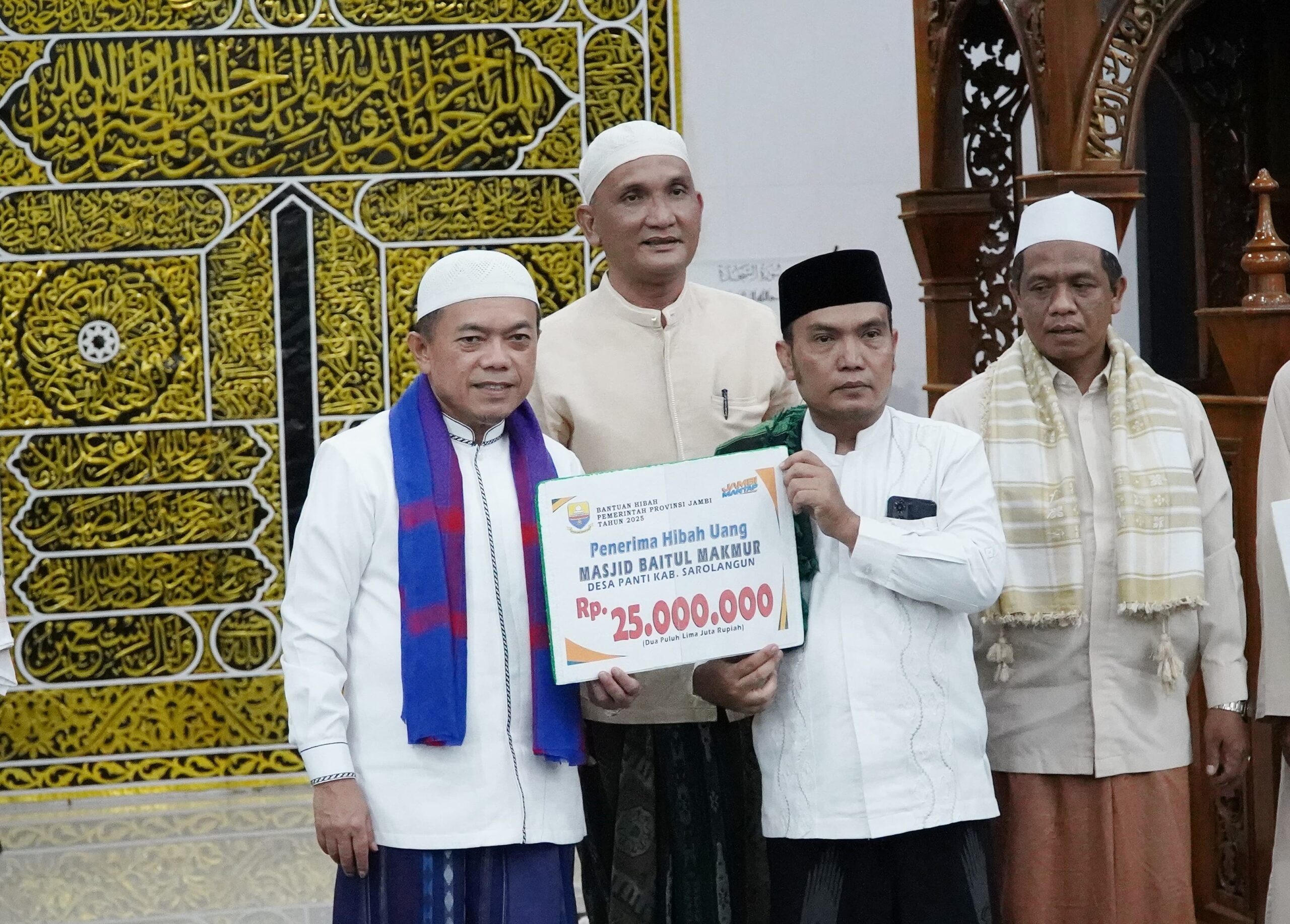 Dalam kesempatan tersebut, Gubernur Al Haris menyerahkan bantuan berupa satu tiket umroh, Al-Qur’an, dana pembangunan masjid, dan santunan kepada masyarakat Desa Panti, Kecamatan Sarolangun.