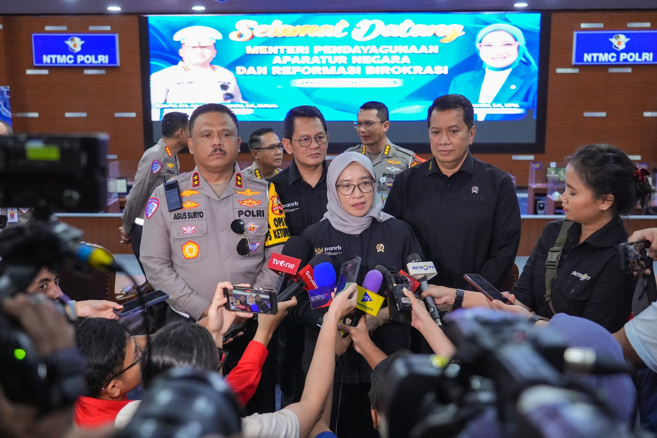 TANYAFAKTA.ID, JAKARTA – Kepala Korps Lalu Lintas (Kakorlantas) Polri Irjen Pol Drs. Agus Suryonugroho S.H, M.Hum menerima kunjungan MenPAN-RB Rini Widyantini dan Wamen PAN-RB Purwadi Arianto di Gedung NTMC Korlantas Polri, Jakarta.