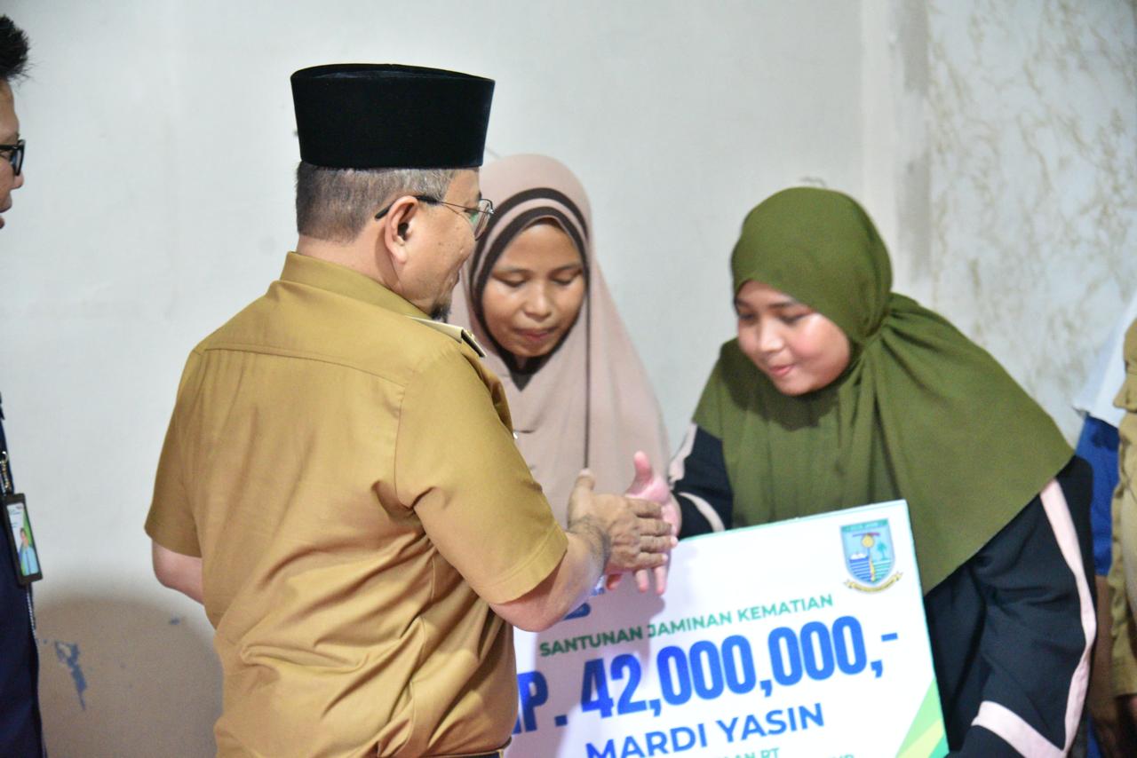“Hari ini saya didampingi oleh Kepala Dinas Ketenagakerjaan dan Kepala Dinas DMPPA, menyerahkan bantuan santunan dari BPJS Ketenagakerjaan kepada keluarga Ketua RT 29 yang meninggal dunia di penghujung Bulan Ramadhan. Ini adalah bentuk kepedulian dan tanggung jawab kami sebagai pemerintah daerah,” ujar Wali Kota Maulana.