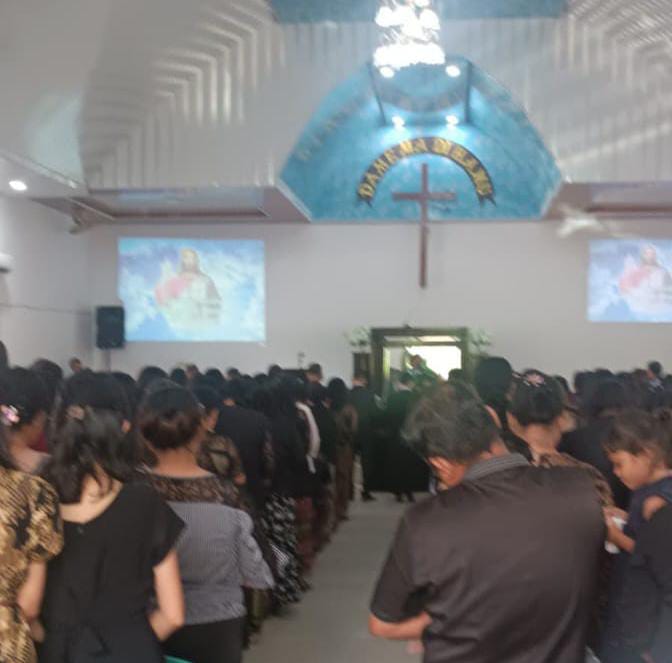 TANYAFAKTA.ID, JAMBI – Ratusan umat Kristiani memadati Gereja Huria Kristen Indonesia (HKI) Kota Baru, Kecamatan Kota Baru, Kota Jambi, pada peringatan Jumat Agung yang digelar Jumat (18/4/2025). Suasana ibadah berlangsung khidmat, dengan jemaat yang memenuhi ruang gereja hingga ke luar.