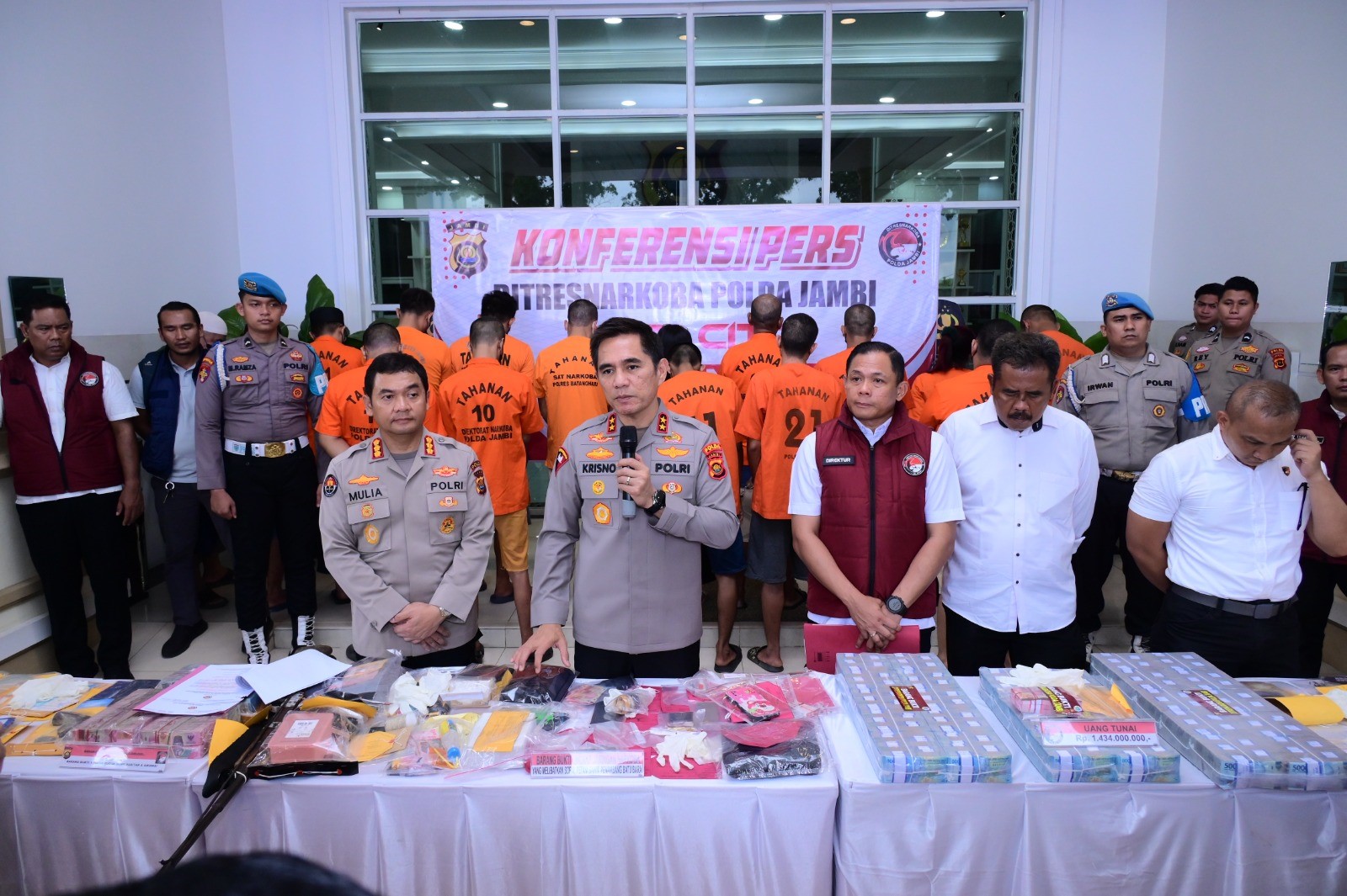 TANYAFAKTA.CO, JAMBI – Kepolisian Daerah (Polda) Jambi kembali mencatatkan prestasi besar dalam upaya pemberantasan narkoba. Dalam konferensi pers yang digelar pada Rabu, 28 Mei 2025, Kapolda Jambi Irjen Pol. Krisno H. Siregar memimpin langsung pemaparan pengungkapan sejumlah kasus narkotika, yang melibatkan jaringan lokal hingga internasional.