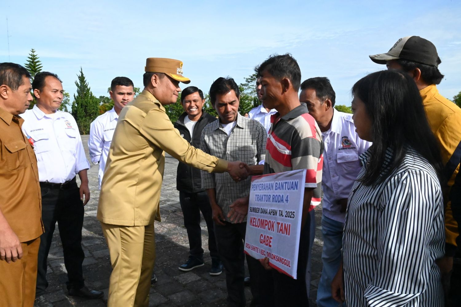 TANYAFAKTA.CO, HUMBAHAS – Bupati Humbang Hasundutan, Dr. Oloan P. Nababan, SH, MH, didampingi Sekretaris Daerah Christison Rudianto Marbun, M.Pd, bersama pengurus DPD Tani Merdeka Indonesia (TMI) Humbahas, menyerahkan bantuan dua unit traktor roda empat kepada dua kelompok tani, yakni Kelompok Tani Gabe dari Desa Sihite I dan Kelompok Tani Sumber Tani dari Desa Simangaronsong, Kecamatan Doloksanggul. Penyerahan dilakukan di halaman Kantor Bupati Humbahas, Bukit Inspirasi Doloksanggul, Senin (23/6/2025).