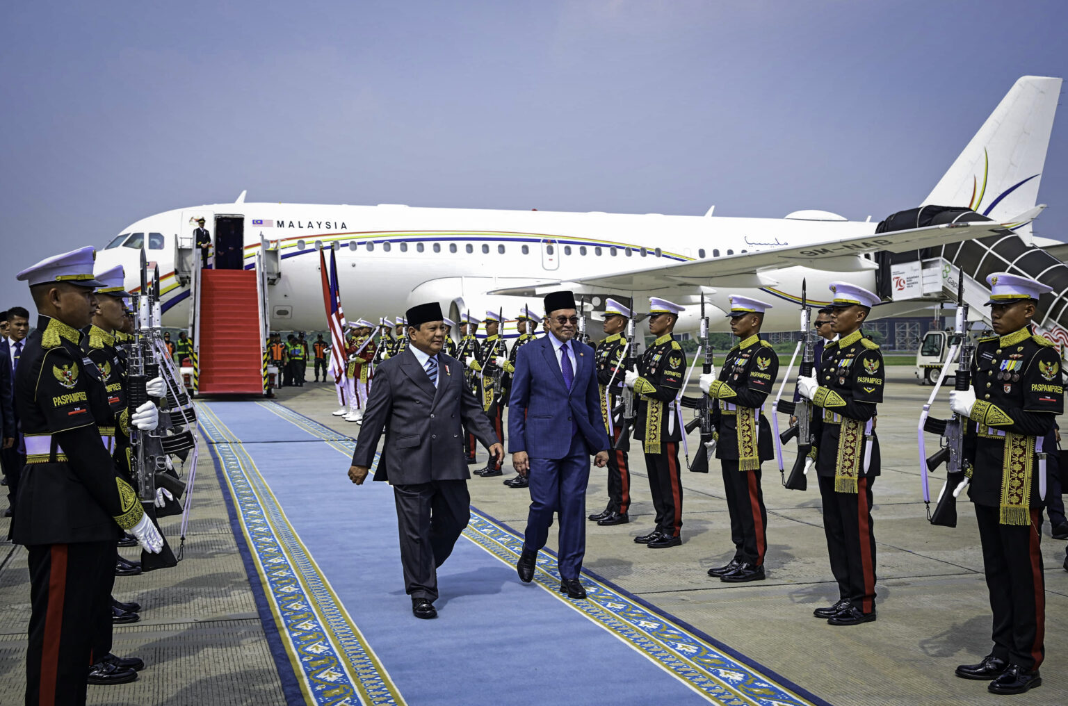 Presiden Prabowo yang tiba lebih awal di lokasi, menyambut kedatangan PM Anwar dengan hangat dan penuh keakraban. Kedua pemimpin berjabat tangan erat dan berbincang akrab saat PM Anwar menuruni tangga pesawat, mencerminkan kedekatan personal serta saling menghargai antarpemimpin.