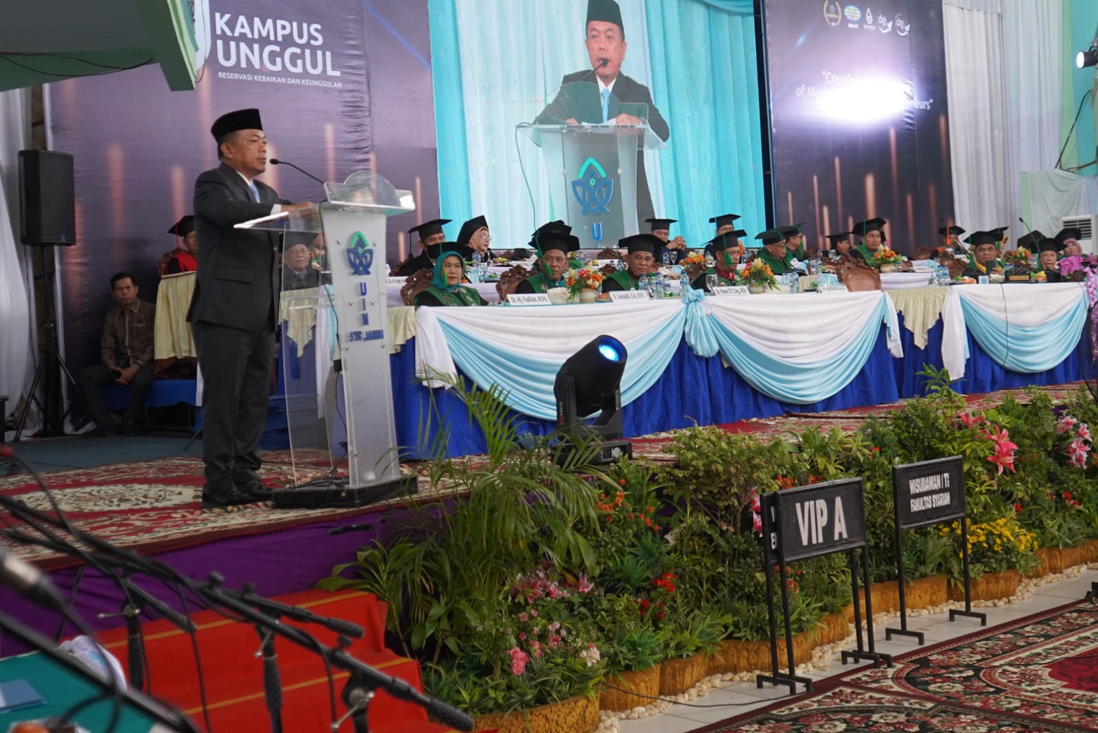 “Syukur Alhamdulillah pada hari yang penuh berkah ini tepatnya tanggal 2 Muharam 1447, UIN Jambi mewisuda S3 sebanyak 40 orang, S2 96 orang, Sain dan Teknologi 104 orang, dan Tarbiyah dan Keguruan 540 orang. Jumlah keseluruhan yang diwisuda hari ini 780 orang. Banyak alumni-alumni UIN yang berbuat untuk Provinsi Jambi dan daerah lainnya. Untuk adik-adikku, masih banyak tahapan yang harus kita jalani ke depan,” ujar Gubernur Al Haris.