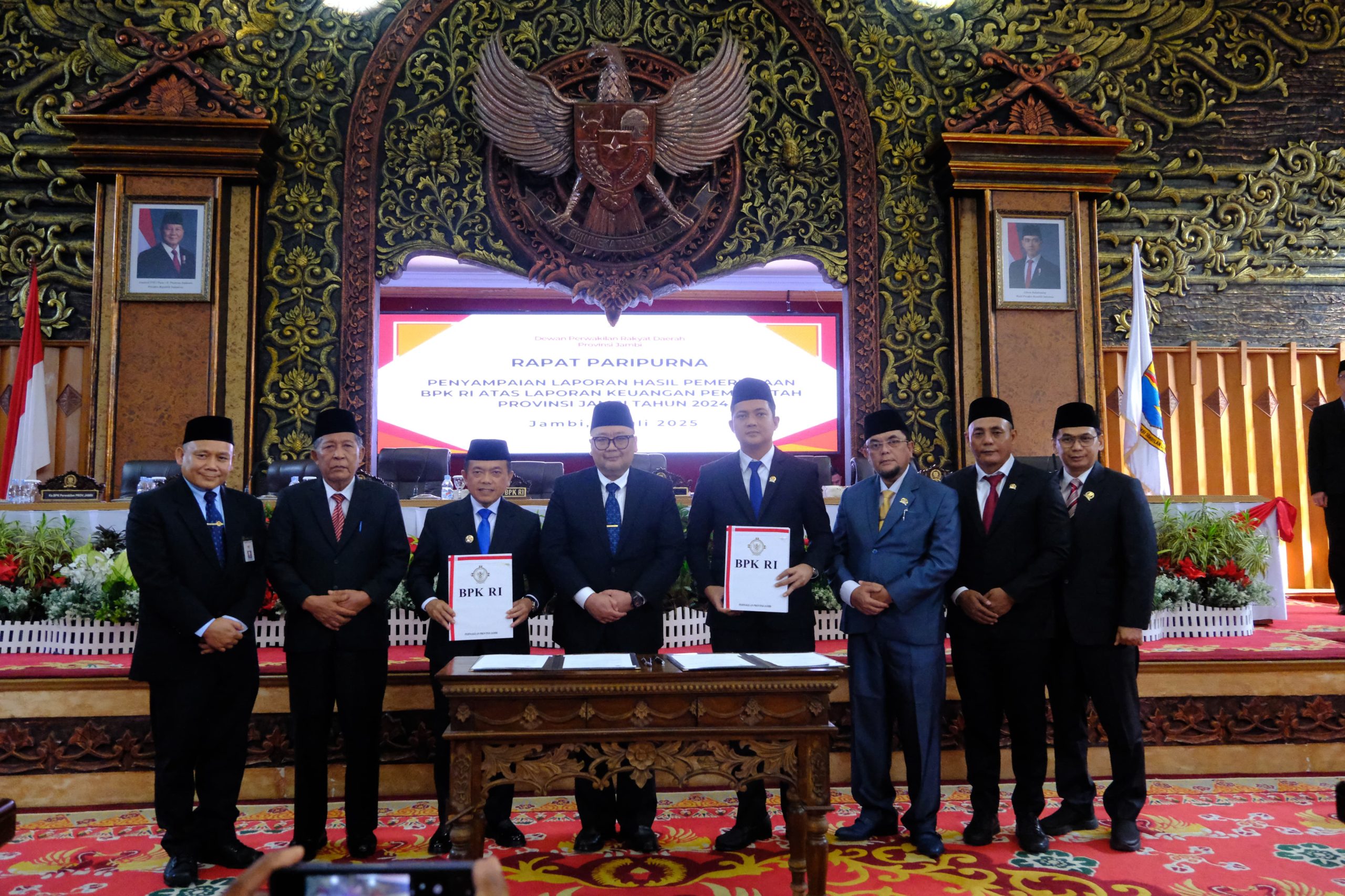 Penyerahan Laporan Hasil Pemeriksaan (LHP) LKPD Provinsi Jambi Tahun 2024 dilakukan dalam Rapat Paripurna DPRD Provinsi Jambi, Jumat (4/7/2025), di Ruang Rapat Utama Gedung DPRD Provinsi Jambi. Gubernur Jambi, Dr. H. Al Haris, S.Sos, MH, hadir langsung menerima LHP tersebut bersama Ketua DPRD Provinsi Jambi, M. Hafiz.