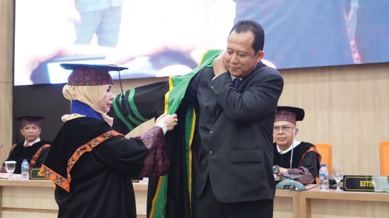 Dalam sambutannya, Direktur Pascasarjana UNJA, Prof. Dr. Dra. Muazza, M.Si., menyampaikan apresiasinya atas keberhasilan Bambang Bayu Suseno.