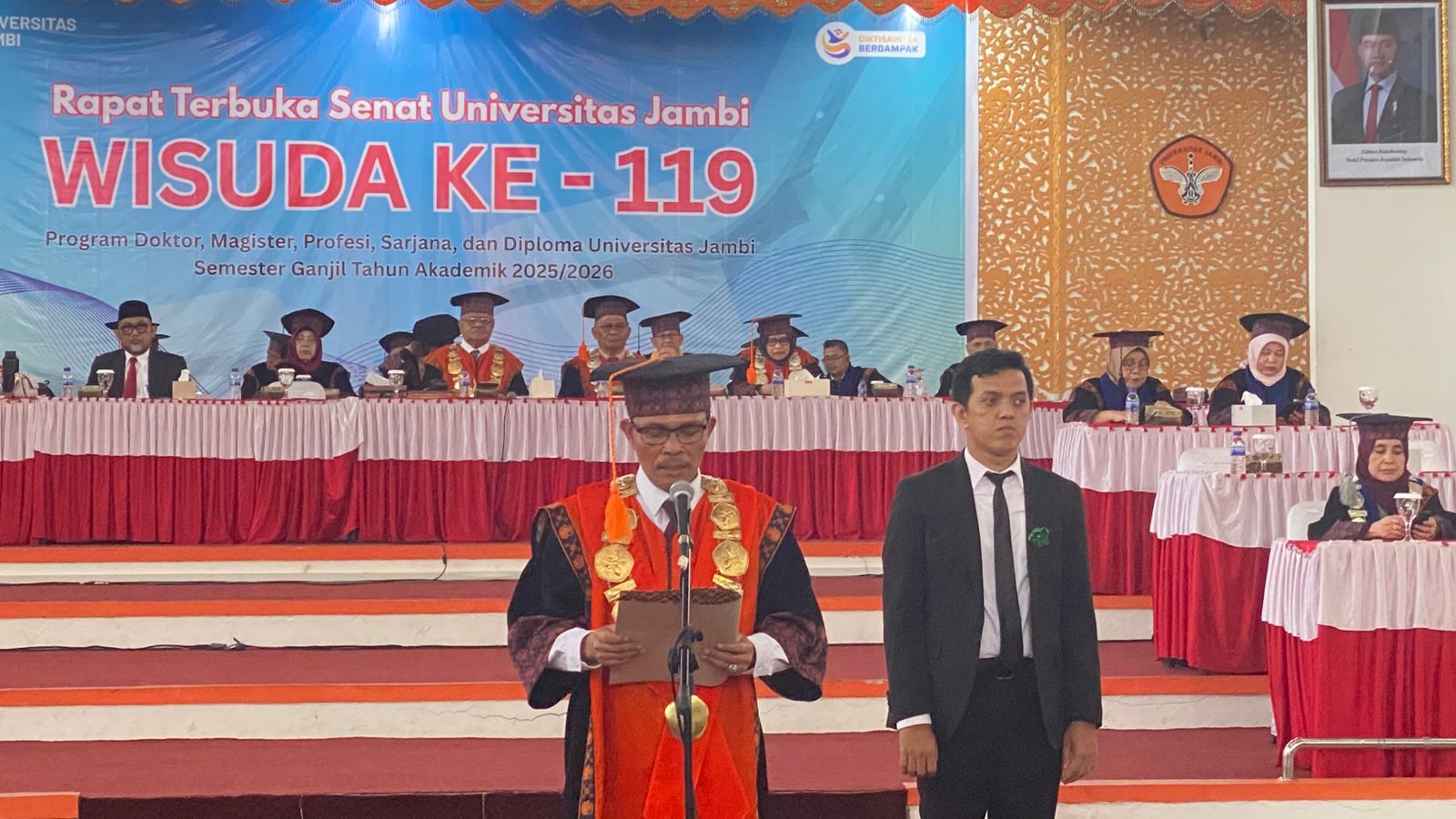 Wisuda ke-119 yang digelar di Balairung Pinang Masak, Kampus Mendalo, Kamis (28/8/2025), menjadi penutup rangkaian wisuda bulan ini. Pada kesempatan tersebut, UNJA mengukuhkan 1.053 lulusan dari berbagai jenjang pendidikan, mulai dari diploma, sarjana, magister, hingga doktor.