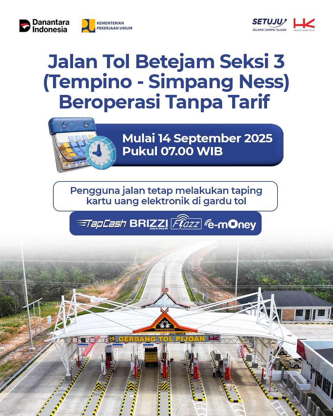 TANYAFAKTA.CO, JAMBI – PT Hutama Karya (Persero) (Hutama Karya) akan mengoperasikan tanpa tarif Jalan Tol Betung – Tempino – Jambi (Betejam) Seksi 3 Segmen Tempino – Simpang Ness sepanjang 18,49 km mulai tanggal 14 September 2025 Pukul 07.00 WIB.