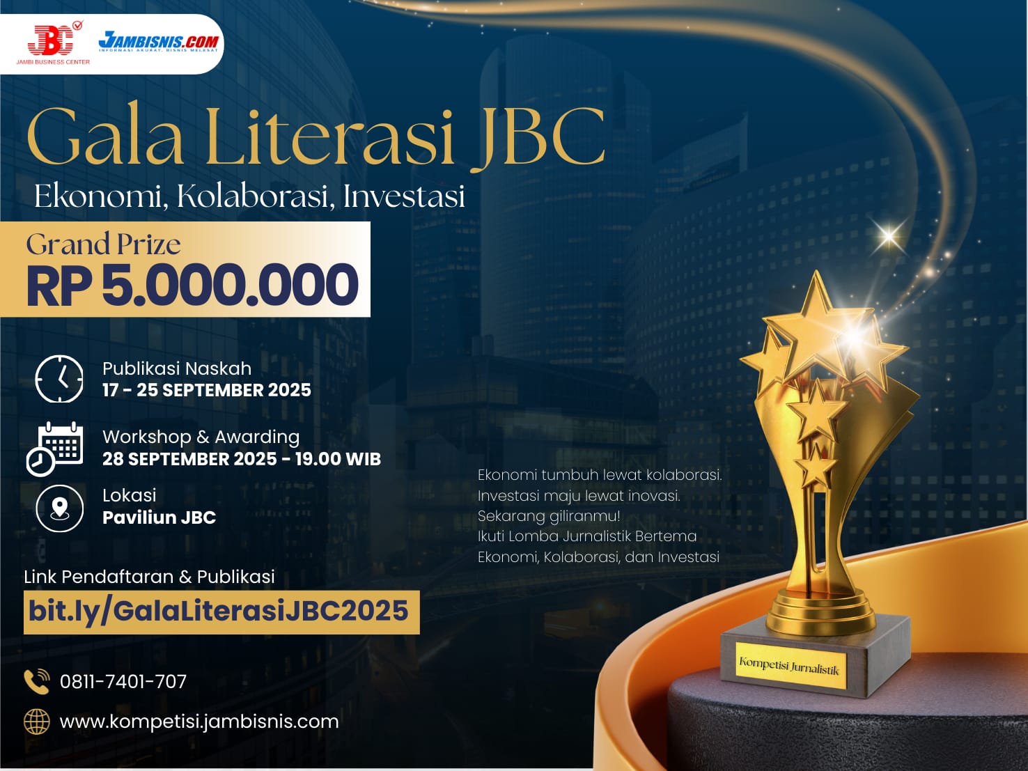 TANYAFAKTA.CO, KOTA JAMBI – Jambi Business Center (JBC) kembali menghadirkan ajang literasi bergengsi melalui Gala Literasi JBC 2025 dengan tema “Ekonomi, Kolaborasi, Investasi”. Kompetisi ini bukan sekadar lomba menulis, tetapi juga wadah bagi jurnalis, pelajar, dan masyarakat umum untuk menuangkan gagasan seputar pembangunan ekonomi Jambi secara kreatif dan konstruktif.