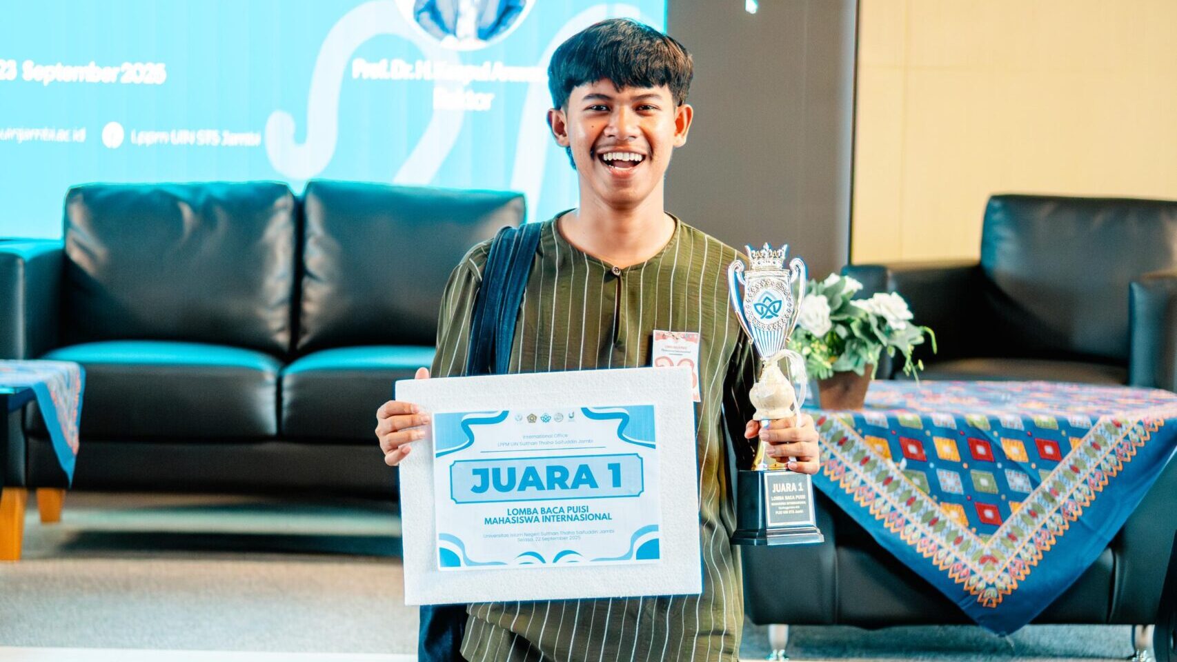 TANYAFAKTA.CO, JAMBI – Mahasiswa Internasional Universitas Jambi (UNJA) Fakultas Keguruan dan Ilmu Pendidikan (FKIP) Program Studi (Prodi) Pendidikan Bahasa dan Sastra Indonesia (PBSI), Asmee Waedoyee berhasil menorehkan prestasi membanggakan dengan meraih juara satu pada lomba baca puisi Mahasiswa Internasional yang diselenggarakan oleh Pusat Layanan Kerja Sama Internasional (PLKI) Lembaga Penelitian dan Pengabdian Kepada Masyarakat (LPPM) Universitas Islam Negeri Sulthan Thaha Saifuddin (UIN STS) Jambi yang berlangsung di Ampiteater lantai 4 Gedung Rektorat UIN STS Jambi pada, (23/09/2025).