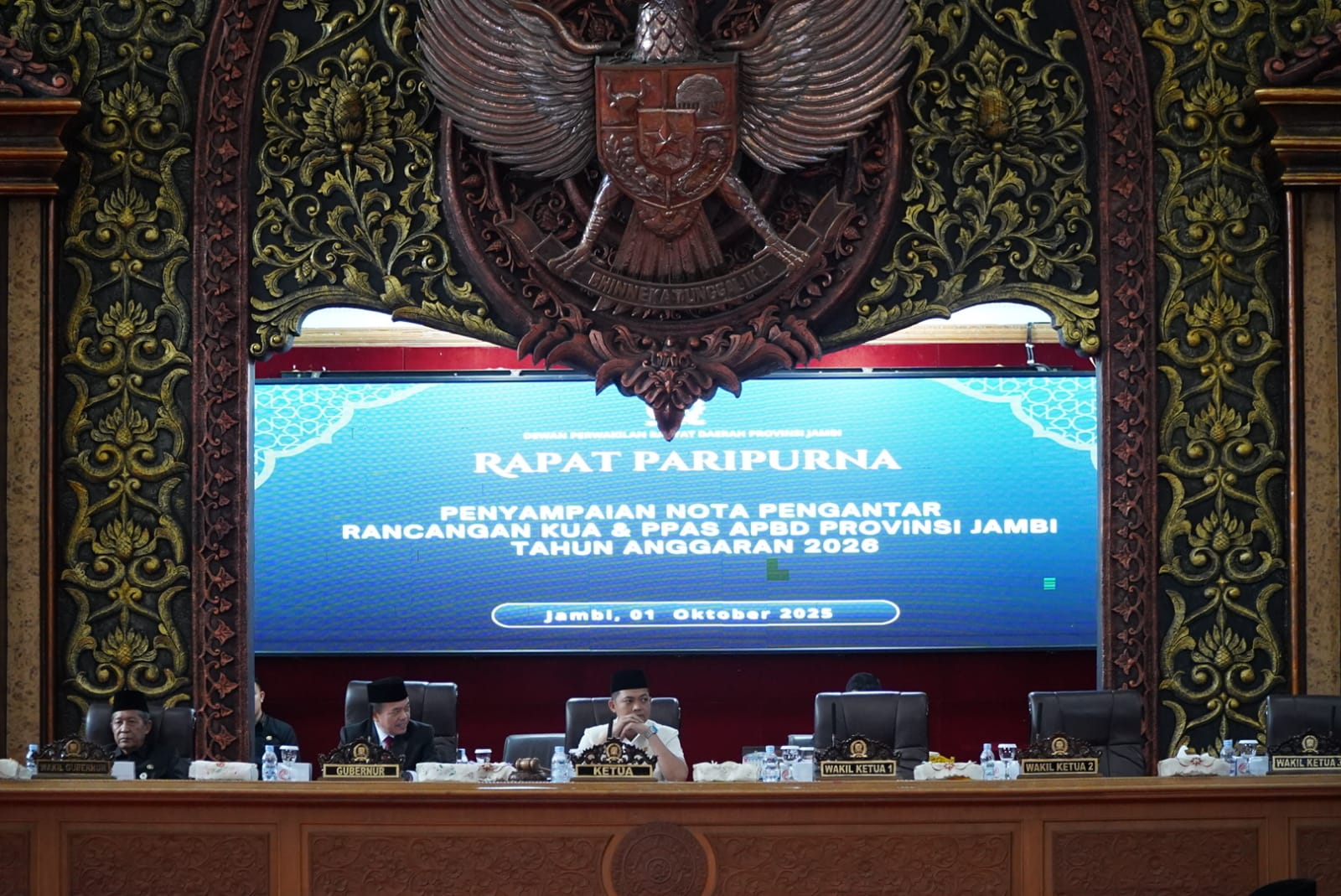TANYAFAKTA.CO, JAMBI – Gubernur Jambi Dr. H. Al Haris, S.Sos., MH bersama Wakil Gubernur Jambi Drs. H. Abdullah Sani, M.Pd.I menghadiri Rapat Paripurna DPRD Provinsi Jambi dengan agenda Penyampaian Nota Pengantar Rancangan Kebijakan Umum Anggaran (KUA) dan Rancangan Prioritas Plafon Anggaran Sementara (PPAS) APBD Tahun Anggaran 2026, bertempat di Ruang Sidang Utama Gedung DPRD Provinsi Jambi, Rabu (01/10/2025).