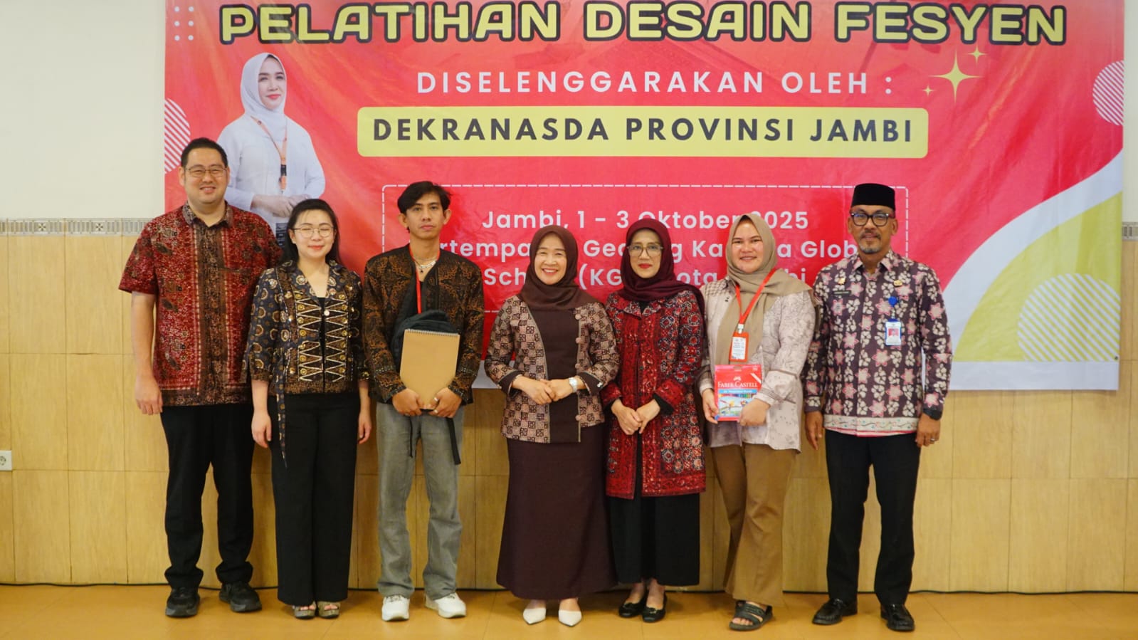 TANYAFAKTA.CO, JAMBI – Ketua Dewan Kerajinan Nasional Daerah (Dekranasda) Provinsi Jambi, Hj. Hesnidar Haris, SE, (Hesti Haris) menghadiri sekaligus membuka Pelatihan Desain Fesyen yang diselenggarakan oleh Dekranasda Provinsi Jambi di Gedung Karunia Global School, Kota Jambi, Rabu (01/10/2025).