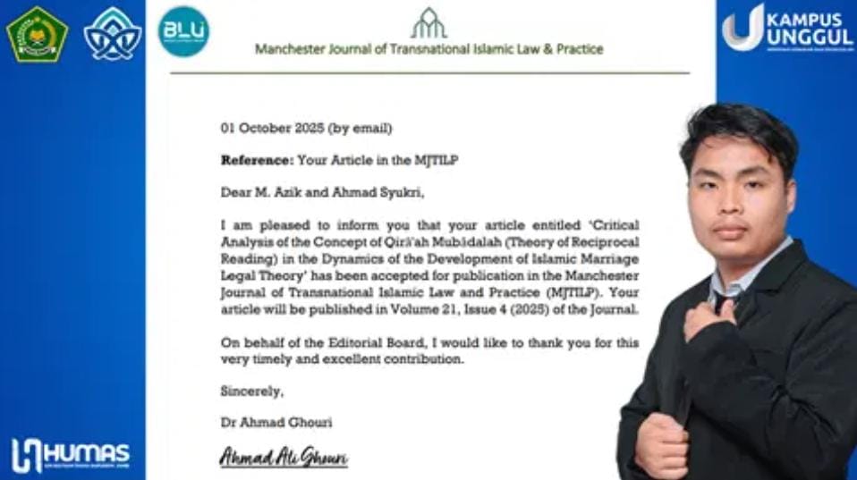 Artikel ilmiahnya yang berjudul “Critical Analysis of the Concept of Qirā’ah Mubādalah (Theory of Reciprocal Reading) in the Dynamics of the Development of Islamic Marriage Legal Theory” diterima di jurnal internasional bereputasi Scopus Q2. Jurnal tersebut adalah Manchester Journal of Transnational Islamic Law & Practice yang terbit di United Kingdom.