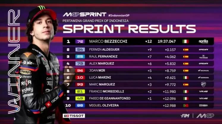 Bagnaia sendiri gagal menambah poin pada sesi Sprint Race, setelah menjadi pembalap paling terakhir menyentuh garis finis. Pembalap Italia ini saat ini mengumpulkan total 274 poin. Diikuti Marco Bezzecchi dengan 254 poin.