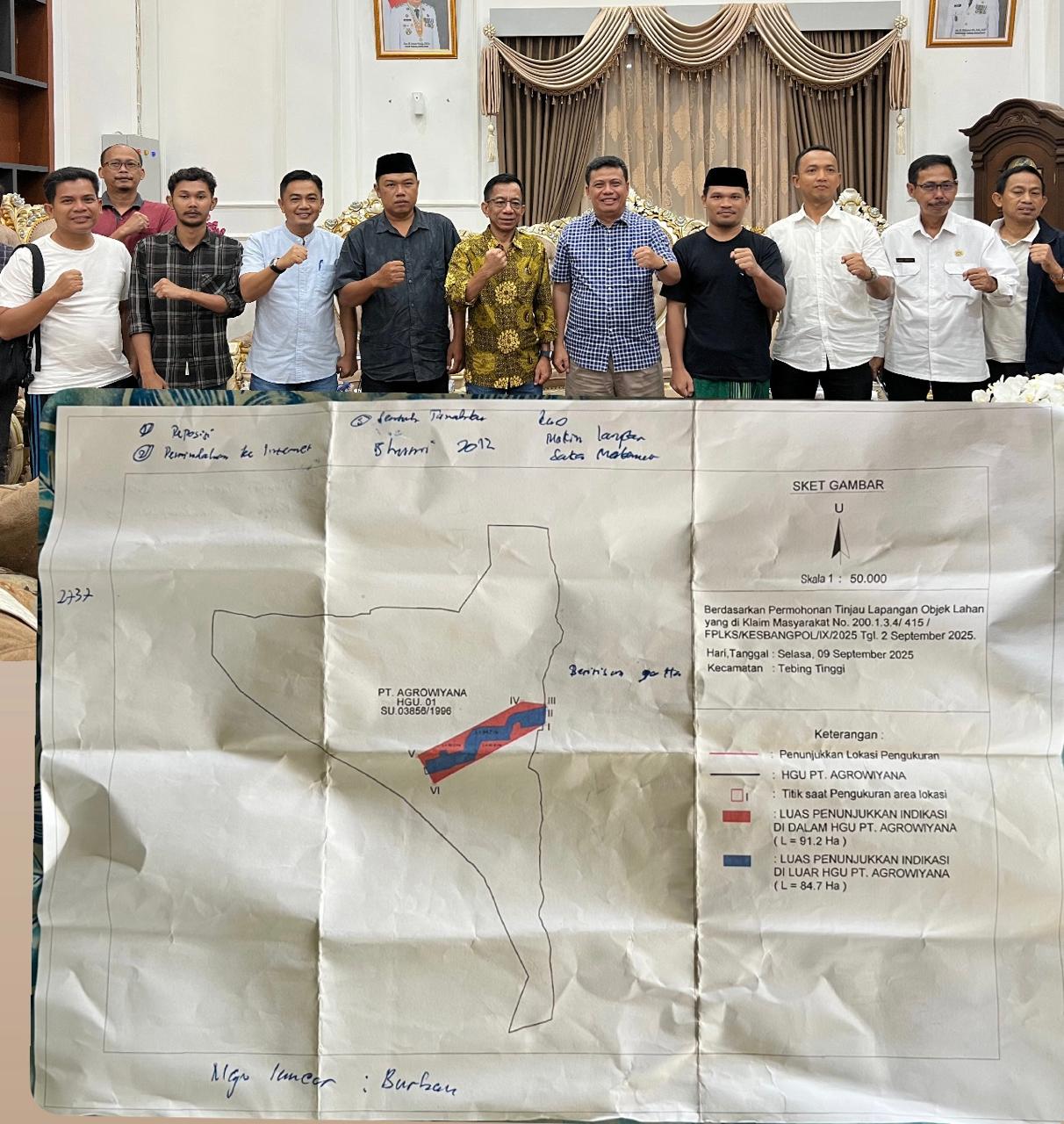 Rapat tersebut membahas hasil pemetaan lapangan oleh ATR/BPN terkait konflik lahan antara kelompok tani penggarap Desa Purwodadi dengan PT. Agrowiyana di Kecamatan Tebing Tinggi.