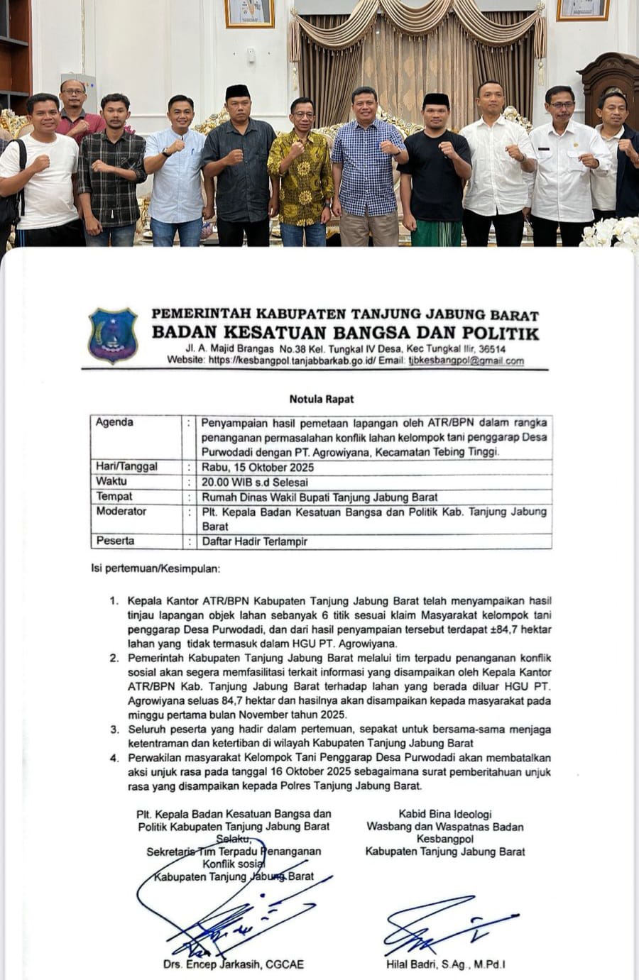 Sementara itu, perwakilan Kelompok Tani Penggarap Desa Purwodadi, Wiranto B.Manalu menyampaikan sikap tegas dalam menindaklanjuti tahapan selanjutnya berdasarkan hasil pemaparan dari Kepala Kantor Pertanahan Tanjung Jabung Barat yang disaksikan langsung oleh Wakil Bupati Tanjung Jabung Barat, dengan jelas menyebutkan bahwa lahan sekitar 84,7 Ha bukan bagian dari HGU PT.Agrowiyana.