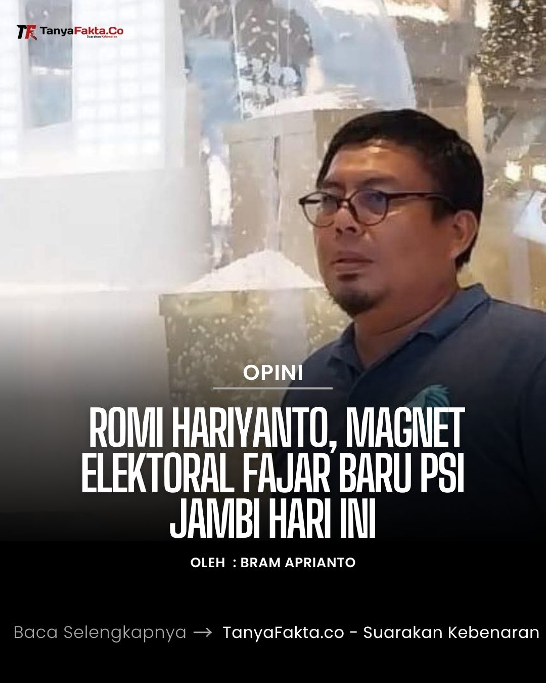 TANYAFAKTA.CO, JAMBI – Lanskap peta politik Jambi ke depan nama Romi Hariyanto mantan Bupati Tanjung Jabung Timur dua periode ini kini menjelma menjadi figur yang tak hanya diperhitungkan secara elektoral, tapi juga menjadi magnet baru bagi Partai Solidaritas Indonesia (PSI) di Provinsi Jambi. Kehadiran Romi dalam orbit PSI bukan sekadar pertemuan politik biasa. Ia membawa energi baru dan citra perubahan yang sejalan dengan semangat partai yang dikenal progresif dan anti status quo itu. PSI, yang selama ini mencari figur lokal dengan integritas dan basis kuat, tampaknya menemukan sosok yang pas dalam diri Romi.